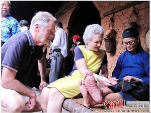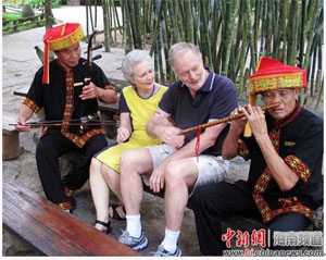 此次,BBC攝制組到檳榔谷取景拍攝,巧妙地將外國(guó)人的視角與海南黎苗文化元素相融合。同時(shí),在兩位外國(guó)主持人Oaten和Acem的參與下, 深入體驗(yàn)當(dāng)?shù)乩杳缥幕?。Acem的中文十分流利,進(jìn)入檳榔谷不到10分鐘就融入到了檳榔谷的黎族文化,熱情的用當(dāng)?shù)乩枵Z(yǔ)“波隆”與村民們熱情的打招呼,向黎族文身阿婆學(xué)習(xí)編織黎錦,和當(dāng)?shù)乩杓野⒏?、阿妹一起體驗(yàn)竹竿舞,品嘗獨(dú)具黎家特色的沖浪石板烤魚。最后,還一同感受大型原生態(tài)黎苗文化歌舞演出 《檳榔•古韻》。精彩紛呈的表演不僅帶來(lái)視覺上的震撼,更是在歡快的打竹聲中,將攝制組的工作人員都吸引到舞臺(tái)上一起參與互動(dòng)。