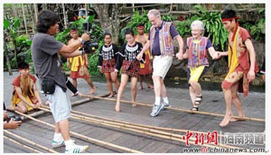 Acem與Oaten與黎族阿哥阿妹跳起竹竿舞